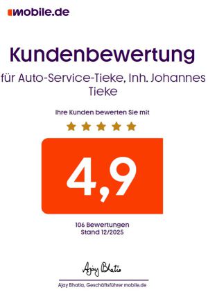 Der Auto-Service-Tieke bietet eine große Auswahl von Neu-, Jahres- & Gebrauchtwagen. Alle Fahrzeuge werden vor der Auslieferung komplett durch unser Fachpersonal gecheckt, überarbeitet und letztendlich auch noch einmal von der GTÜ (Ingenieurbüro Funke) überprüft. Vorhandene Mängel werden dabei sofort beseitigt, sodass Sie mit ruhigem Gewissen in ihr neues Traumauto steigen können. Sollte die Inspektion in den nächste 6 Monaten anfallen wird diese direkt erledigt und auch kleinere Kratzer werden gleich poliert oder - falls nicht mehr möglich – in der hauseigenen Lackiererei lackiert. Ebenfalls kümmern wir uns um den gesamten Anmeldeprozess, sodass Sie sich zurücklehnen können. Schlussendlich wird der neue Wagen für Sie nochmal in unserer Aufbereitung schick gemacht und komplett gereinigt und aufbereitet.